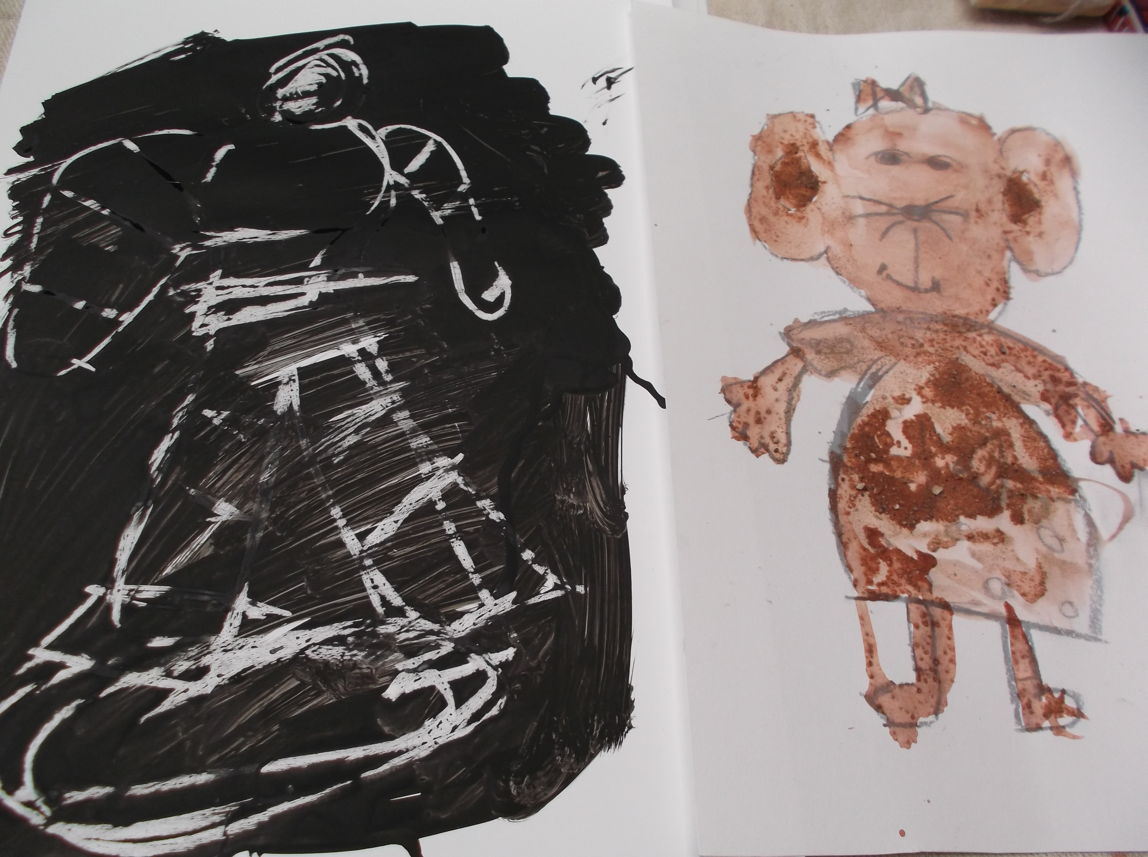 22 JulHaving finally remembered to take some photos of the amazing work produced today in the drawing workshop….using all sorts of materials and working the different media together – loved the use of sand in the drawing on the right of Minnie Mouse. Such a pleasure teaching really inventive and enthusiastic children; I could have carried on for another couple of hours quite happily.